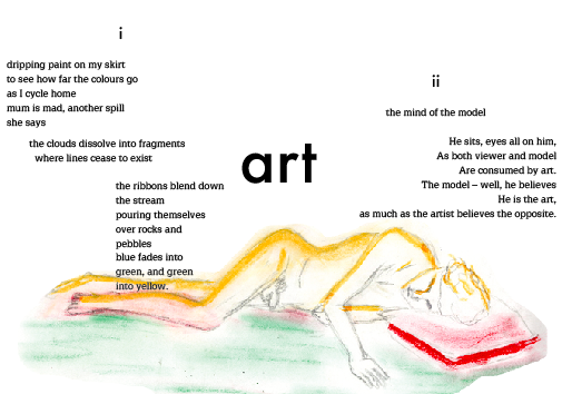 My favourite part has definitely been the huge variety of responses we have gotten from prompts; just seeing how some people go about a writing exercise or see the same body in front of them so differently is so interesting. The biggest challenge was trying to find a last-minute life model two days before an event when we realised the guy we got in contact with on Craig’s List was not the man for us (let’s just say he was fully convinced Trump was tapping into his phone calls).