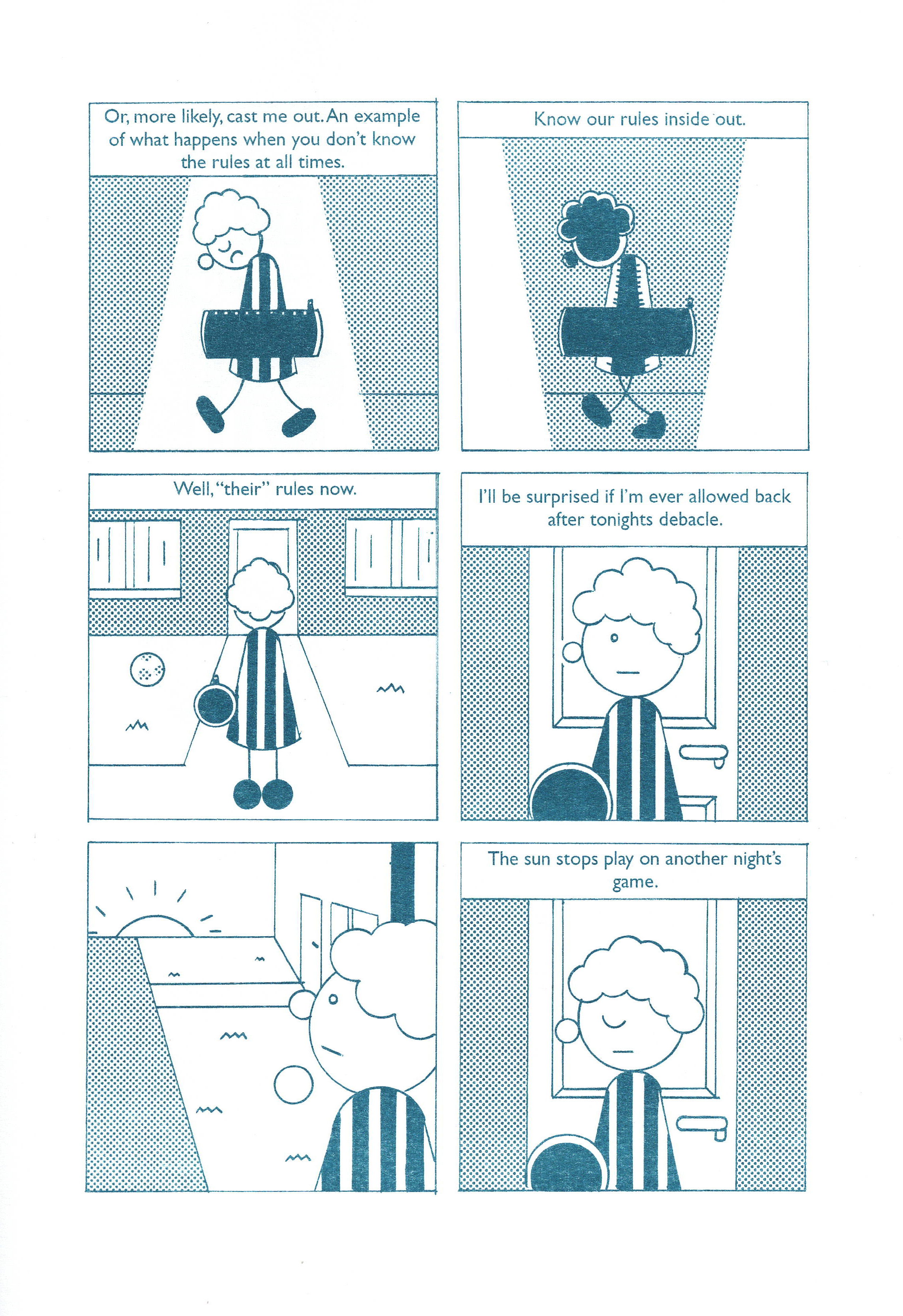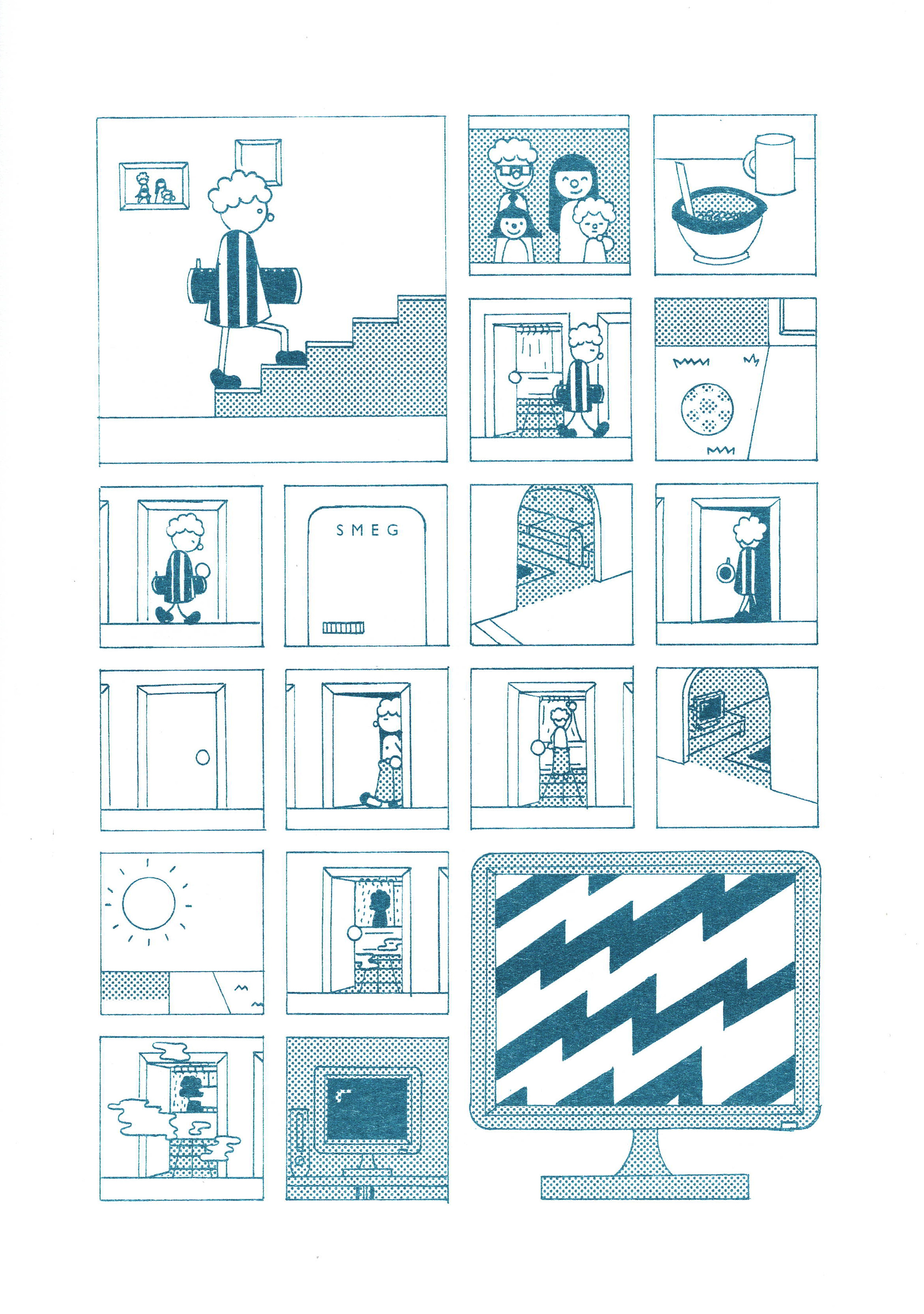 MNO is a “football noir” (patent pending), following a woman named Lizzie as she tries to unravel the mystery that is her brother’s late night hobbies. It’s about long hours, seeing connections where there might or might not be, and following rules to absurd degrees. “MNO” is technically the concept, the stories actual title is “Midnight Official”. I work best when I have silly or arbitrary rules that I have to follow, so my hope is that I will end up with a series of comics with titles that start with M N & O. I think about bands like the Magnetic Fields or Casiotone for the Painfully Alone, who give themselves rules or concepts and try and build the work around that. So I’ll set myself the challenge of making a western comic, but it has to fit on two sides of A4. I enjoy being kept in a box and find inspiration in the box.