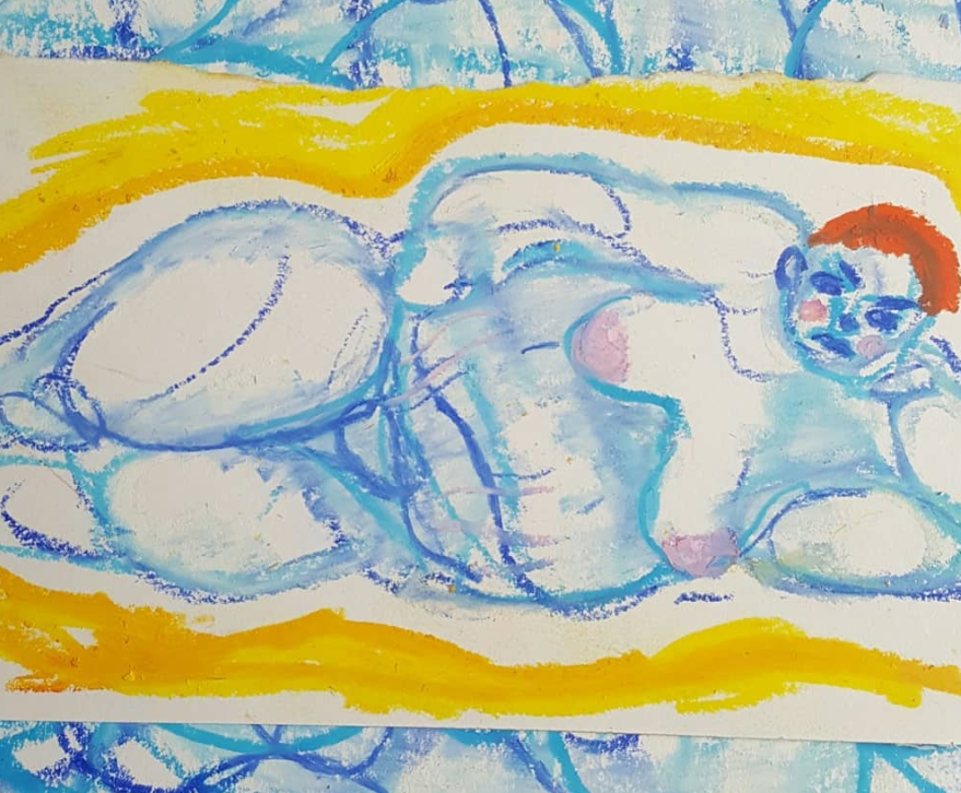 Most of my inspiration comes from Instagram where I have found a whole movement of incredible fat artists such as Chloe Swords (@fat_utopia), who has made some amazing work using fat suits. One of my favourite artists is photographer Lauren Crow (@4locrow), whose exploration of intimacy has been really important to me; I love their use of colour and their style really speaks to me. My recent drawings have been heavily influenced by the work of Charline Bataille (@charlinebataille), their angry-looking femme characters are what I’ve always wanted my drag persona to emulate. Laurence Philomene (@laurencephilomene) often features orange wigs in their work, inspiring my drag persona’s orange hair. I particularly like their non-binary portrait series, which they’ve described as a way of representing unrepresented non-binary individuals. Amongst the countless performers who inspire me, Max Legroom (@max_legroom) is one of my favourites. His sense of humour and style is unique to his persona, something I hope to one day achieve in my own drag.