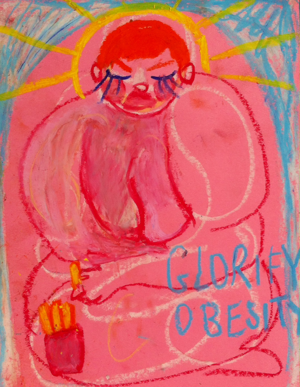 That all bodies are of value. I want to use my art to represent others like me. I want to communicate that we shouldn’t be limited to other peoples’ perceptions of our bodies, and that you should create your own rules about your body. I grew up being told what to do and what not to wear, and that my fatness was shameful. My art separates me from this, creating a space where fat bodies are beautiful. Whilst painting my body I use soft lines and bright colours, and see a beauty that I can’t whilst looking at myself in mirrors or photos.