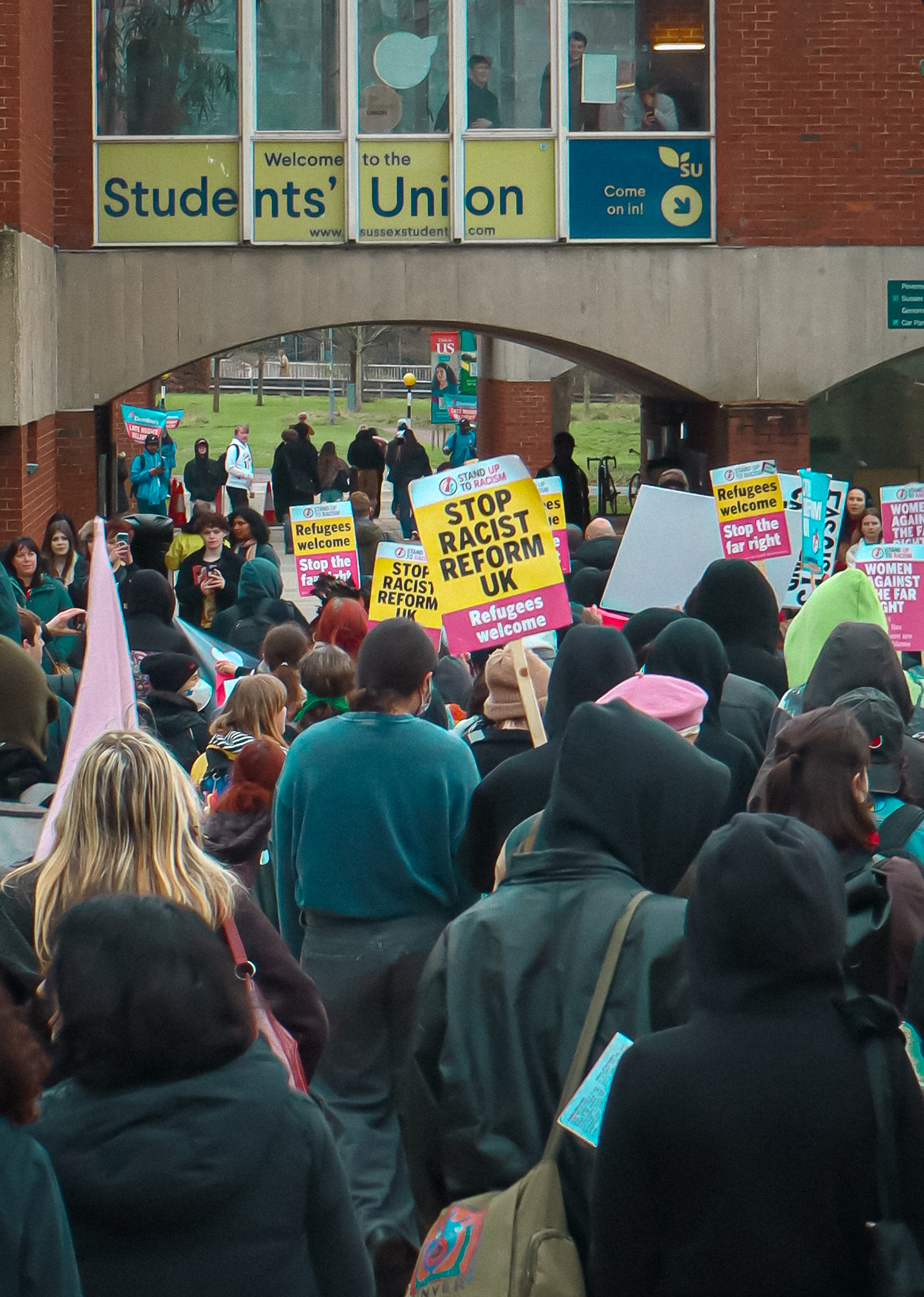 A second protest took place an hour later, at 12:30 pm, outside Falmer House. Framed as a ‘walkout’ protest, it involved members and leaders of various societies leaving the Refreshers Fair in protest under the banner “Sussex Students Against Discrimination”.