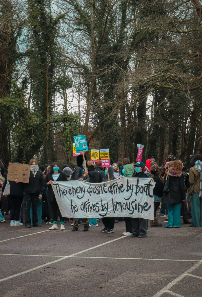 Speaking to The Badger, one student protester said their opposition stemmed from what they alleged was Nigel Farage’s “track record of racism” and what they described as the party’s “scapegoating of immigrants”. Immigration emerged as a central theme of the protest, with demonstrators at the front of the march holding a sign reading: “The enemy doesn’t arrive by boat, he arrives by limousine”.